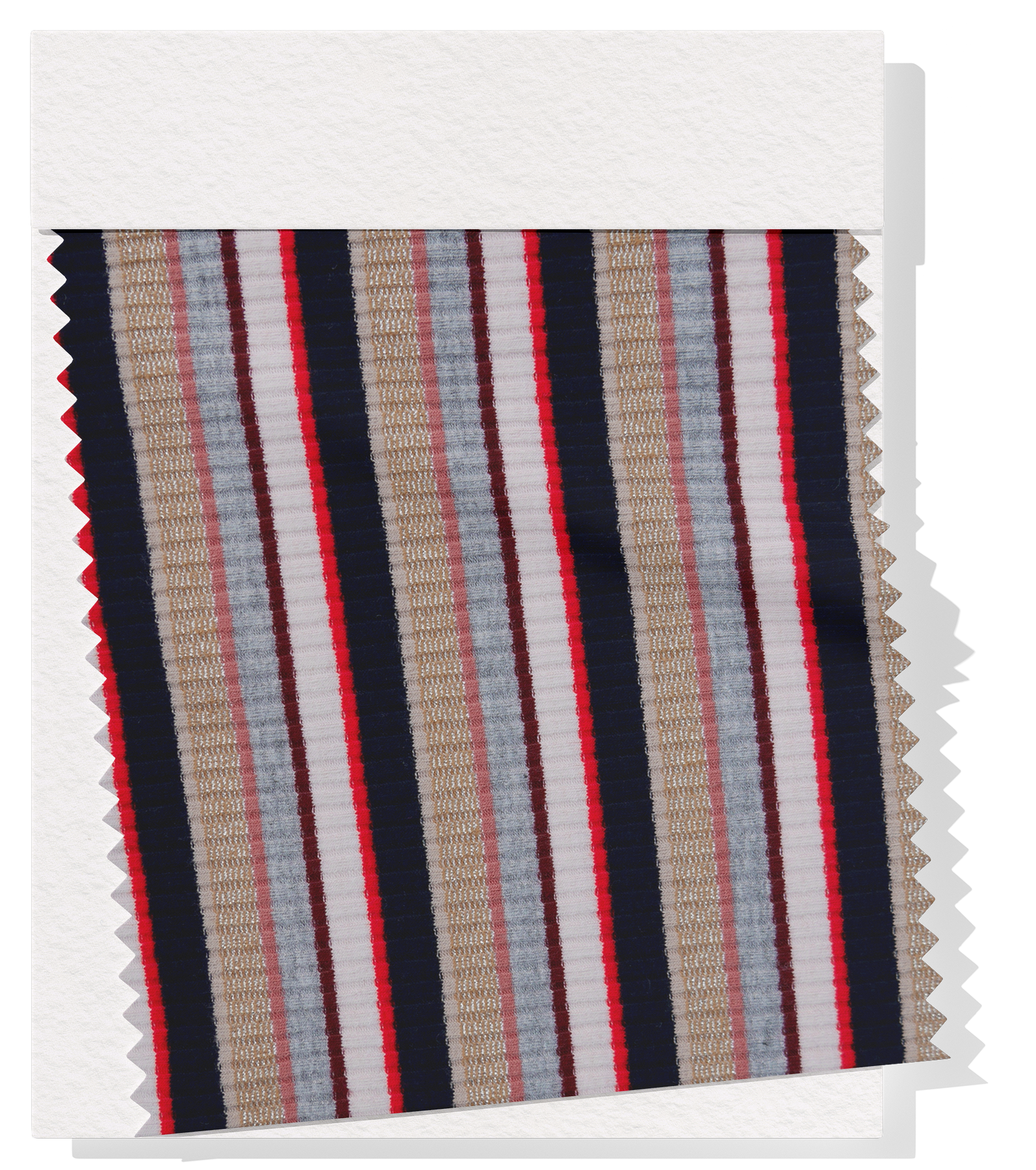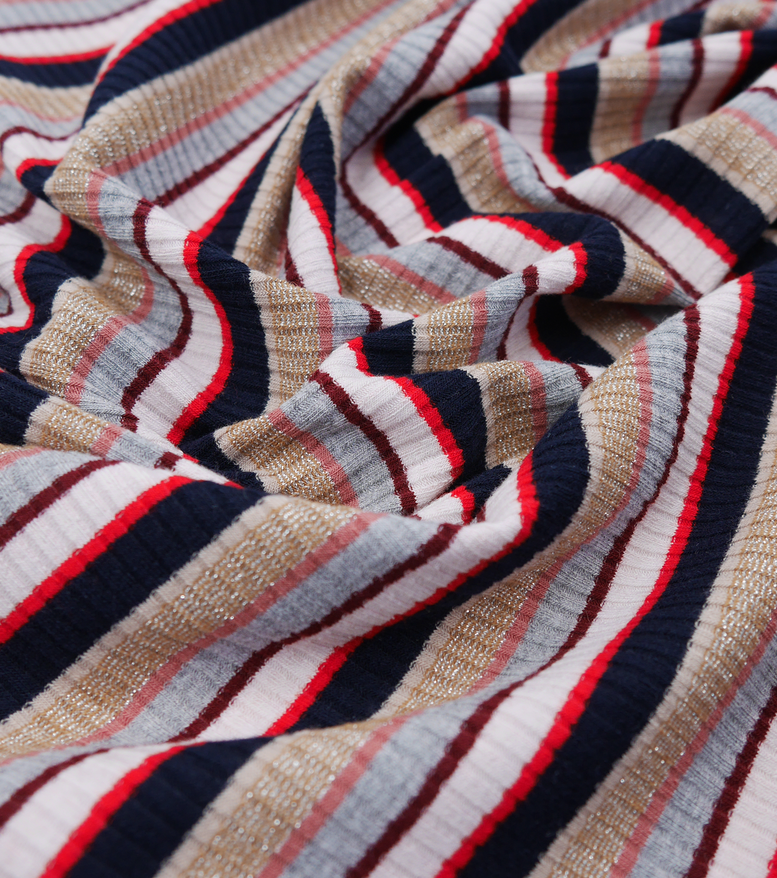 This polyester spandex rib features classic vertical stripes in black, camel, grey, and red, interwoven with a hint of metallic thread for a subtle shimmer.