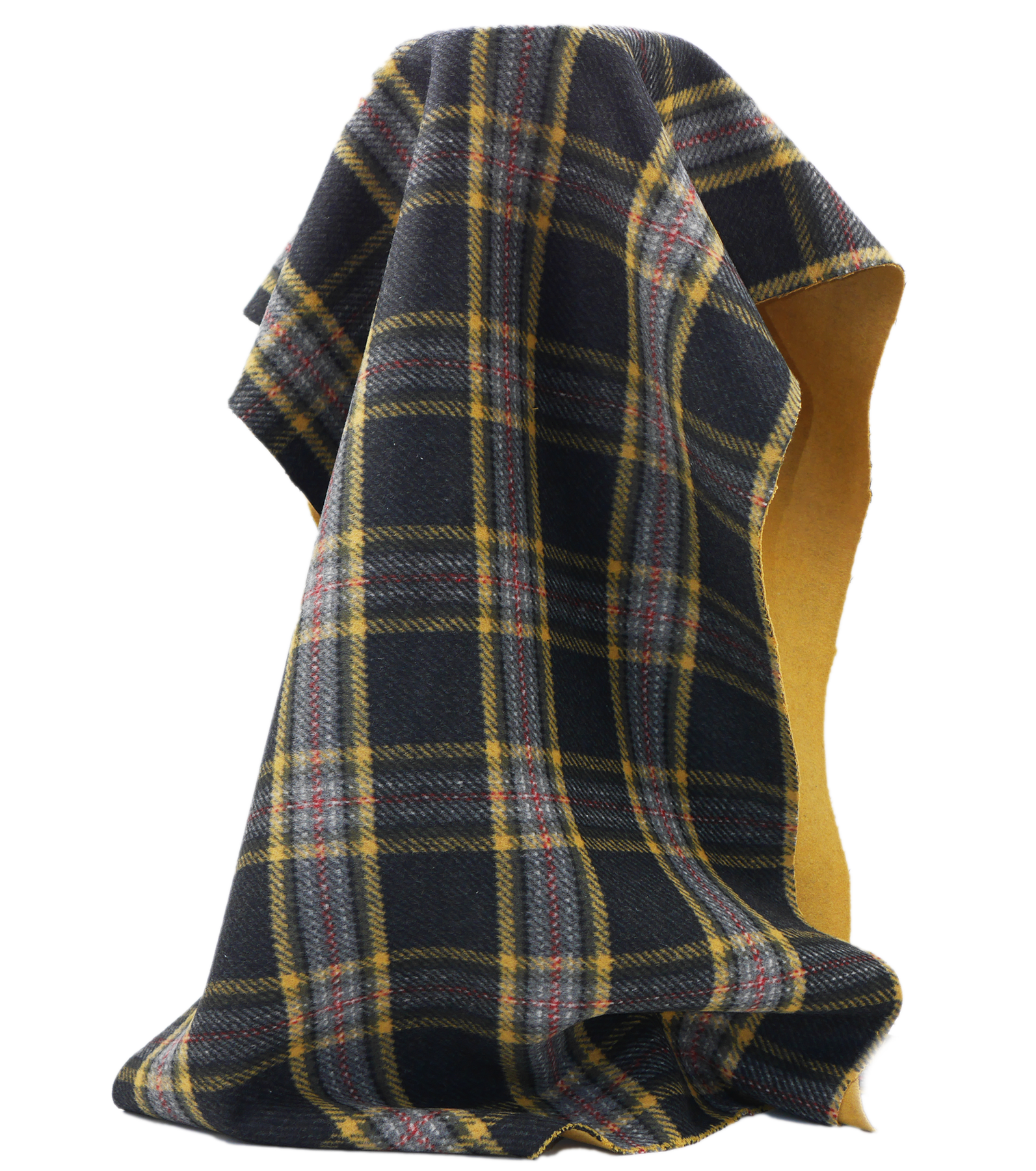This charcoal, yellow ochre, and red tartan has a real rugged, heritage charm. The reverse side features a solid yellow ochre colour.